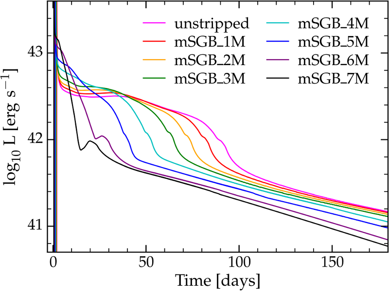 Below plot shows light curves obtained from explosions of a 15-Msun star that has been systematically stripped (at a post-main-sequence stage) of hydrogen-rich envelope material in units of 1 Msun. See Morozova et al. (2015), arXiv:1505.06746 for further details.