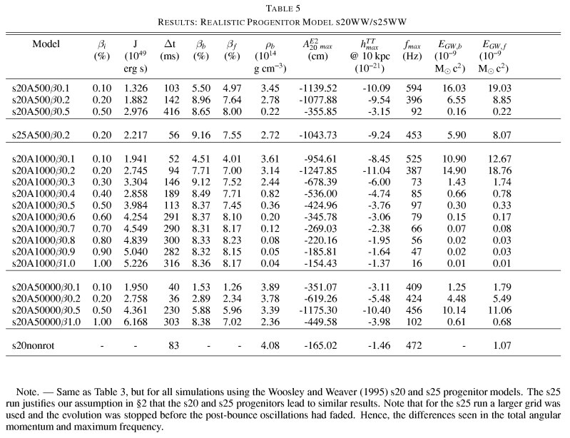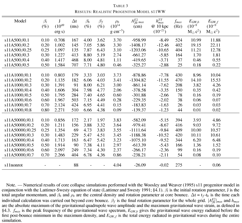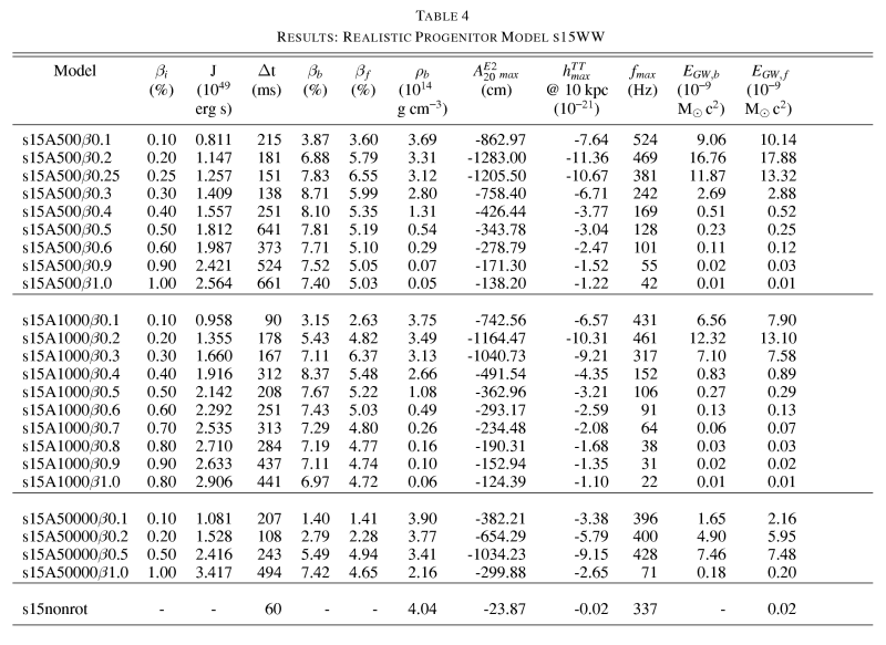 | Please note that the results of this study were obtained with calculations that did not incorporate general relativistic effects and deleptonization (via electron capture on protons) during collapse. Recent results by Ott et al. (2007), Dimmelmeier et al. (2007), and Dimmelmeier et al. 2008 suggest that deleptonization and general relativity have a significant quantitative and qualitative effect on the gravitational wave signature of rotating core collapse. Below we provide the gravitational wave signature data of all our models. The files are named according to the following nomenclature: |